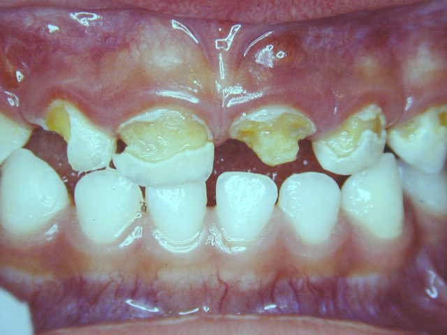 小朋友因長期喝完牛奶後沒有刷牙就睡覺,故造成奶瓶性齲齒.